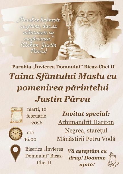 La Parohia „Învierea Domnului” Bicaz-Chei II va avea loc, în intervalul 16.00–18.30, „Sfântul Maslu cu parastas în memoria părintelui Justin Pârvu, la împlinirea a 107 ani de la nașterea sa”. Slujba va fi săvârșită de un sobor de preoți, avându-i ca invitați pe Arhimandritul Hariton Negrea, starețul Mănăstirii Petru Vodă, părintele Valentin Tofan, protopop al Protopopiatului Piatra Neamț, părintele prof. Vasile Păvăleanu, părintele misionar Robert Gavriloae, alături de preoți din cercul misionar pastoral.